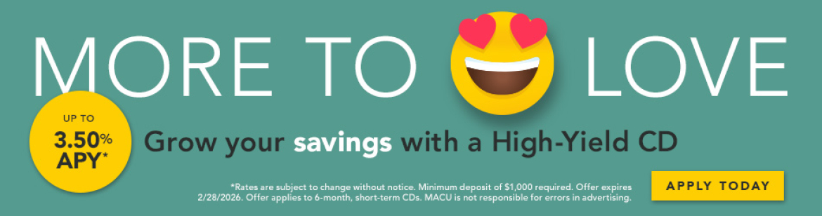 *Rates are subject to change without notice. Minimum deposit of $1,000 required. Offer expires 2/28/2026. Offer applies to 6-month, short-term CDs. MACU is not responsible for errors in advertising.